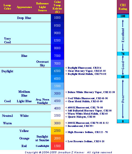 CRI in conjunction with Color Temperature is the best way to draw comparisons between different light sources. A common misconception is that color temperature and color rendering (CRI) both describes the same properties of the lamp. This is not true. Color temperature describes the color appearance of the light source and the light emitted from it. Color rendering describes how well the light renders colors in various objects. However, the two are interconnected. To compare the CRI ratings for any two given lamps, they must have the same color temperature for the comparison to have any meaning. The chart below shows the approximate color temperature and CRI ratings for each type of lamp. Always look on the bulb or ask the salesman for more exact ratings.