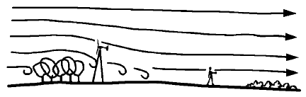 The grove of trees in this example will produce turbulence. A higher tower close to the trees places the wind generator above the turbulence. A shorter tower is safe if placed far enough away from the trees.