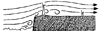 Severe turbulence may be created by the sea cliff in this example. As above, a higher tower will be required near the cliff while a shorter tower will be safe if placed at a great enough distance from the cliff.